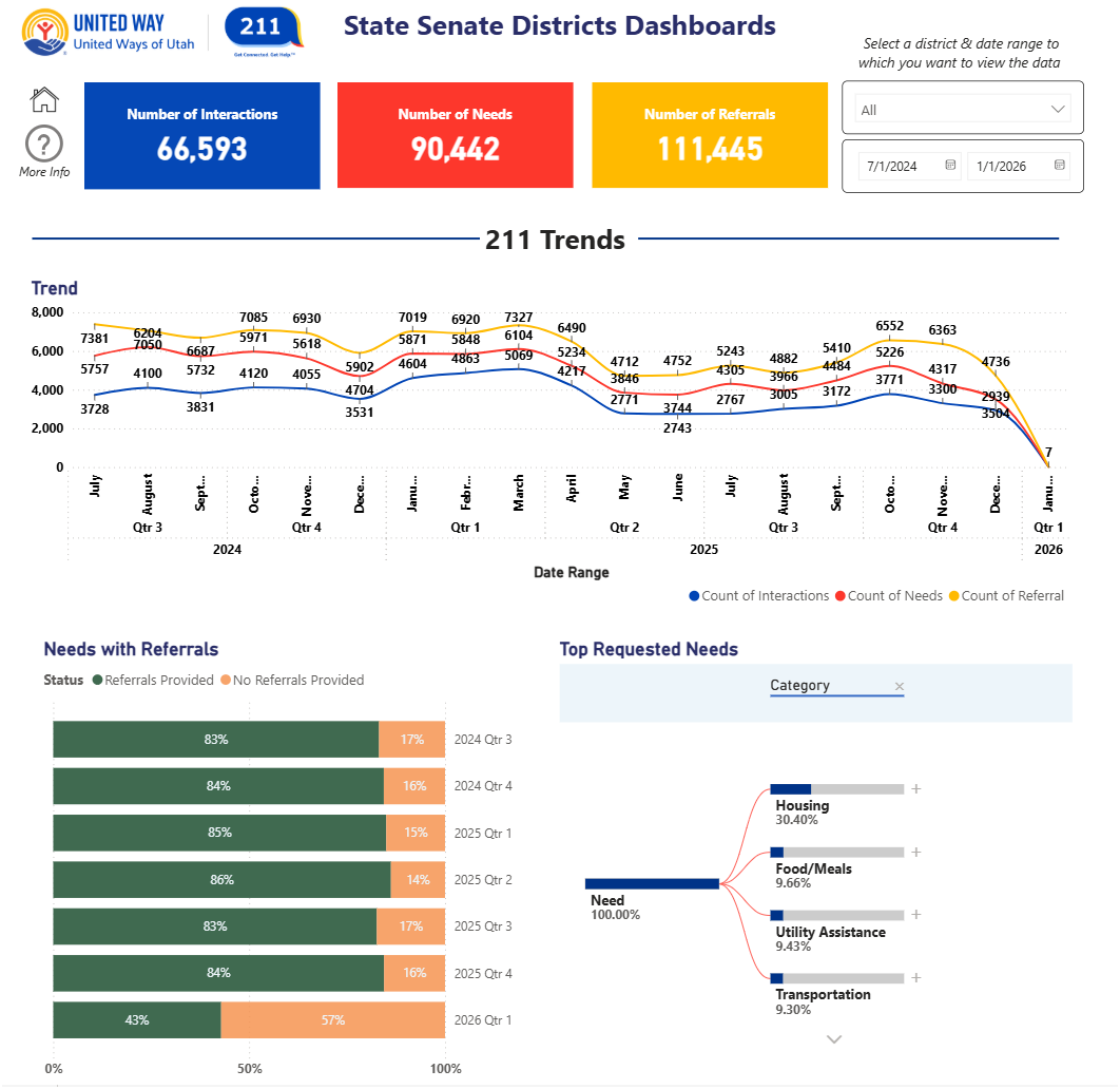 The 211 Utah Legislative Dashboard helps elected officials understand the impact of 211 services within their districts. This report provides a concise overview of 211 service trends for Utah State House, Senate, and Congressional districts, highlighting constituent needs, referrals, and demographic insights. The dashboard supports data-informed decision-making by showing how Utah residents are accessing help and connecting to essential community resources.